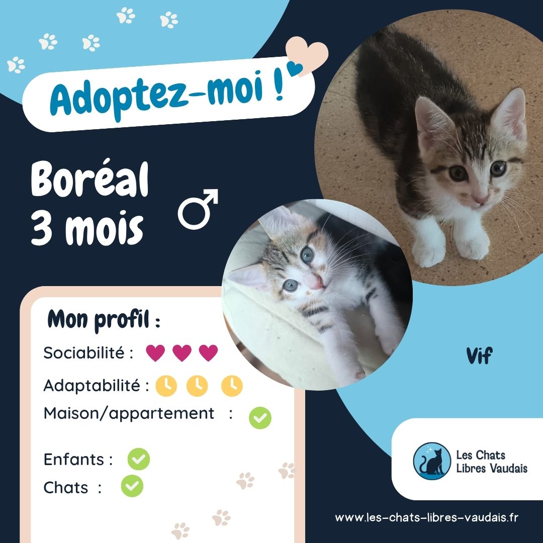 Boréal, c’est un concentré puissant d’amour et de joie. Petit bonhomme déjà très sociable, bien dans ses pattounes, curieux et intrépide. Boréal a de l’énergie a dépensé pour jouer, courir, sauter, mais surtout vous faire rire. Ce petit rigolo a beaucoup de charme et d’amour à offrir. Les moments de sieste se font très souvent sur son humaine. Voilà un petit bout de choux à découvrir et chadopter !
