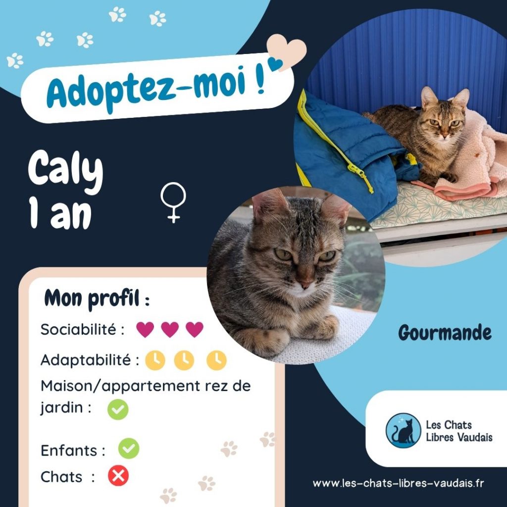 Voici la très jolie Caly, une minette débordante d’amour et de vie. Caly est une chatte très curieuse qui viendra mettre ses pattes dans vos jambes pour surveiller vos faits et gestes. Elle adore observer ses humains, participer à leurs activités (type cuisine, télétravail, ménage aussi..). Caly est aussi très gourmande, elle sera à l’affût pour tenter de récupérer un petit bout de nourriture en faisant ses yeux doux (et comment résister à ses beaux yeux). Elle aime également être au calme, faire sa sieste sur un coussin moelleux agrémentée de quelques caresses. Caly est donc une minette qui aime les plaisirs simples de la vie !