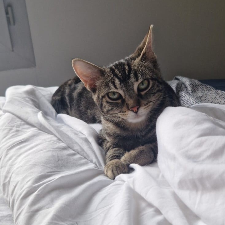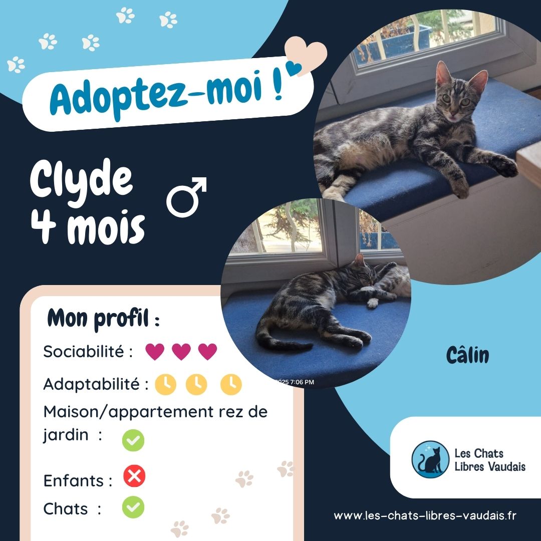 Nous vous présentons le jeune Clyde, 4 mois, craquant à souhait ! Clyde est un chaton très câlin, et toujours collé à son humaine. Il adore se mettre avec son humaine sur le canapé, sur ses jambes pendant le télétravail, et se lover dans des plaids chauds. Clyde aime le confort, mais aussi il est gourmand et sait très bien se faire comprendre. Il miaule quand il veut des gratouilles, et fait son regard insistant quand c’est l’heure de la friandise ! Clyde est adorable, et ne manque pas qualité.