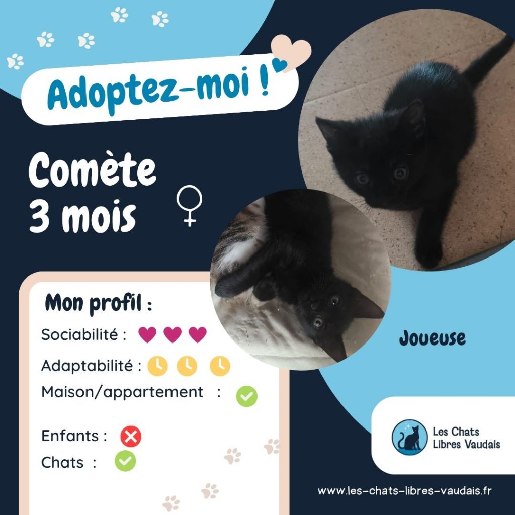 La petite Comète est à la recherche de sa famille pour la vie. Elle promet à ses humains énormément d’amour et de douceur. Car Comète est une chatoune très douce, discrète, et surtout très attachante. Comète est câline, et a un regard très communicatif. La louloute découvre la vie avec plaisir : jeu, gourmandise, ronron. Le programme s’annonce très joyeux pour les humains qui lui donneront sa chance !