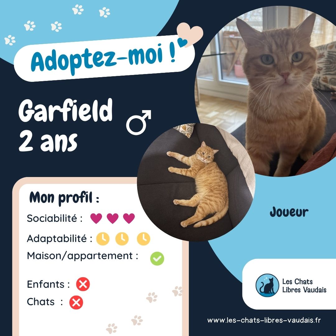 Garfield est adoptable sous contrat associatif, et certificat d’engagement et de connaissance.