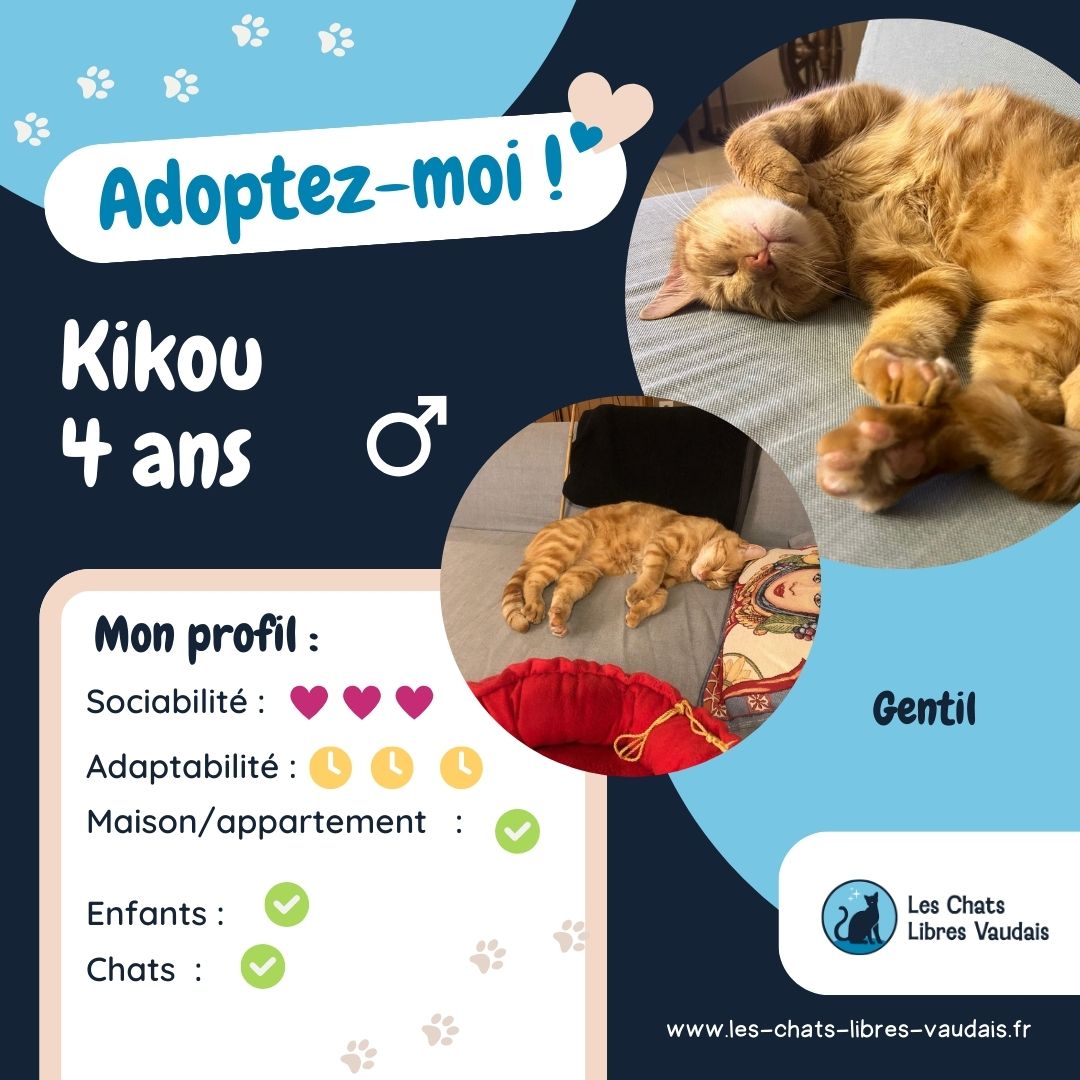 Kikou c’est un beau rouquin, bien dans ses pattounes, âgé d’environ 4 ans ! Kikou c’est un chat extrêmement doux et câlin. Aussi doux qu’un agneau est l’expression qui lui irait le mieux ! Dans sa journée type Kikou adore faire ses siestes sur le canapé, le lit, dans les plaids, sur ses humains.. Ce pot de colle ne rate jamais une occasion pour une séance de ronron. Kikou est aussi gourmand, et joueur. Il aime chasser les mouches, courir après une balle. Kikou est facile à vivre, c’est un plaisir de l’avoir dans son quotidien !