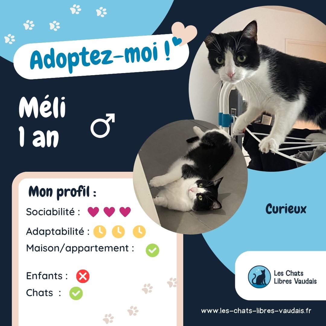 Méli est un jeune adulte adorable ! C’est le petit rigolo du groupe, toujours là pour vous faire rire, vous remonter le moral, avec ses beaux yeux. Méli adore la présence humaine, c’est un chat curieux qui pourra vous suivre et vous observer toute la journée dans vos tâches quotidiennes ! Méli est aussi un grand adepte de la sieste dans les endroits les plus confortables de la maison. Voilà un chat qui vous réserve beaucoup d’amour et de belles aventures.