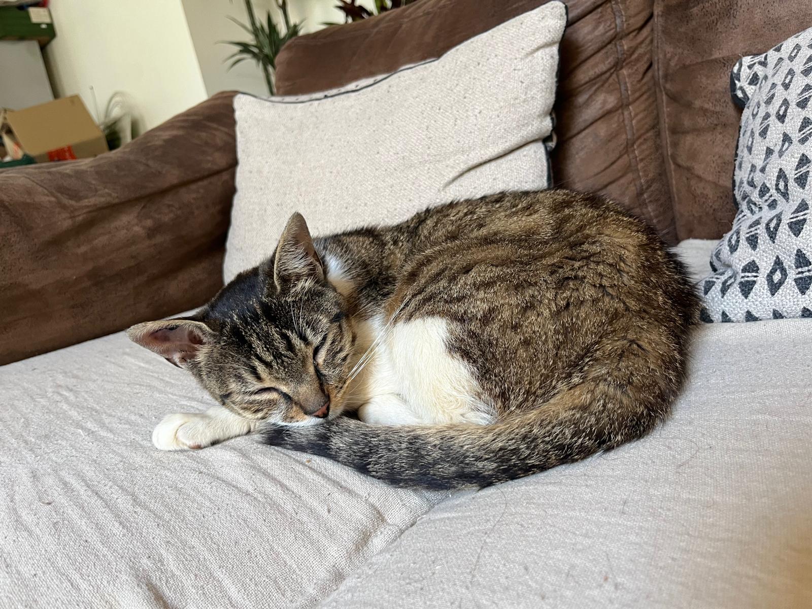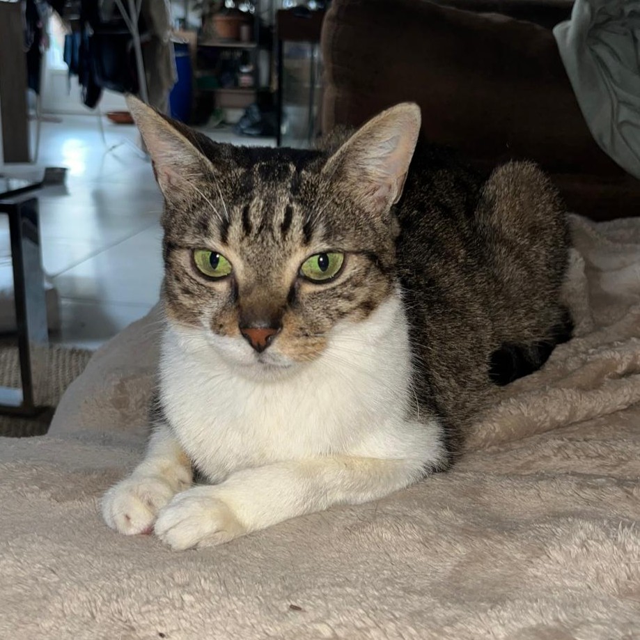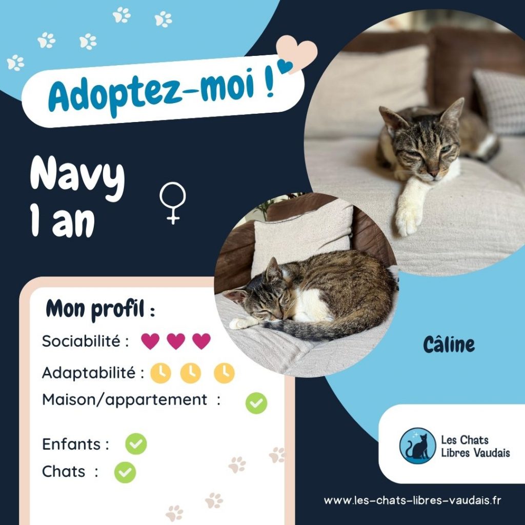 Vous ne trouverez pas plus affectueuse et douce que Navy ! Jeune adulte, Navy sait ce qu’elle aime : les caresses, les gratouilles, les plaids douillets, et quand même un peu les friandises. Navy aime aussi jouer, mais ce n’est pas son activité préférée. Ce qu’elle préfère c’est observer ses humains, les accompagner dans leurs missions quotidiennes, faire les beaux yeux pour avoir une friandise. Navy est rigolote, facile à vivre, et extrêmement attachante.