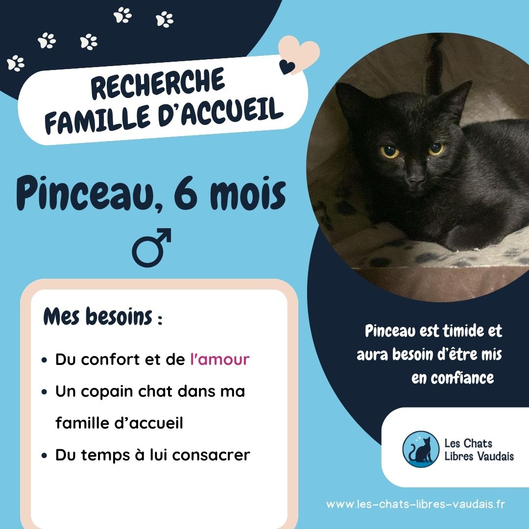 Il sera un peu timide au début, et devra apprendre à faire confiance en l’humain. Pinceau est propre, et apprécie énormément la présence de ses congénères chats. Nous aimerions que la famille d’accueil de Pinceau ait déjà un chat qui pourrait l’aider à se détendre et se sentir bien !