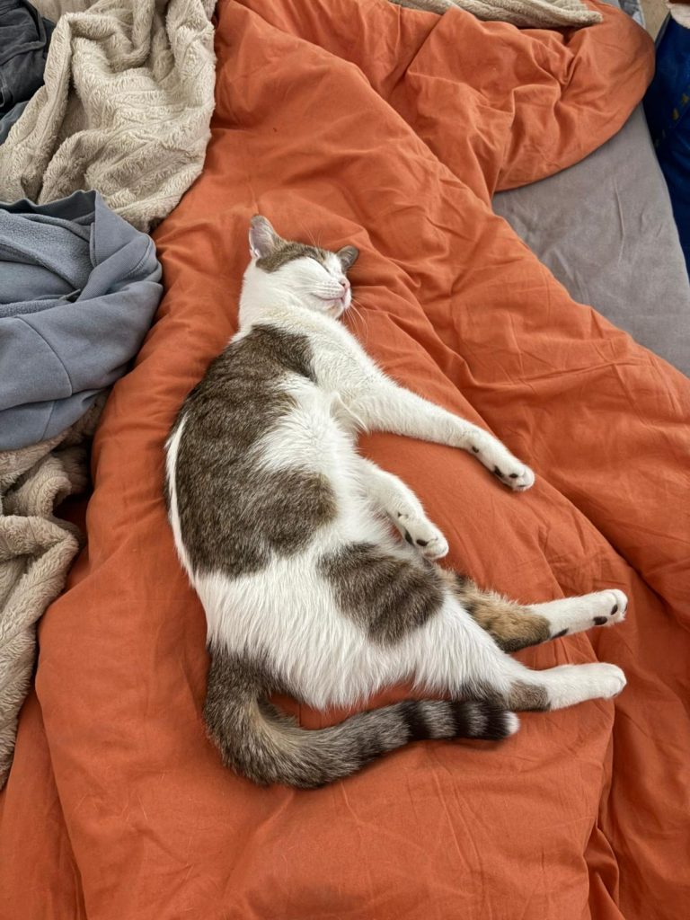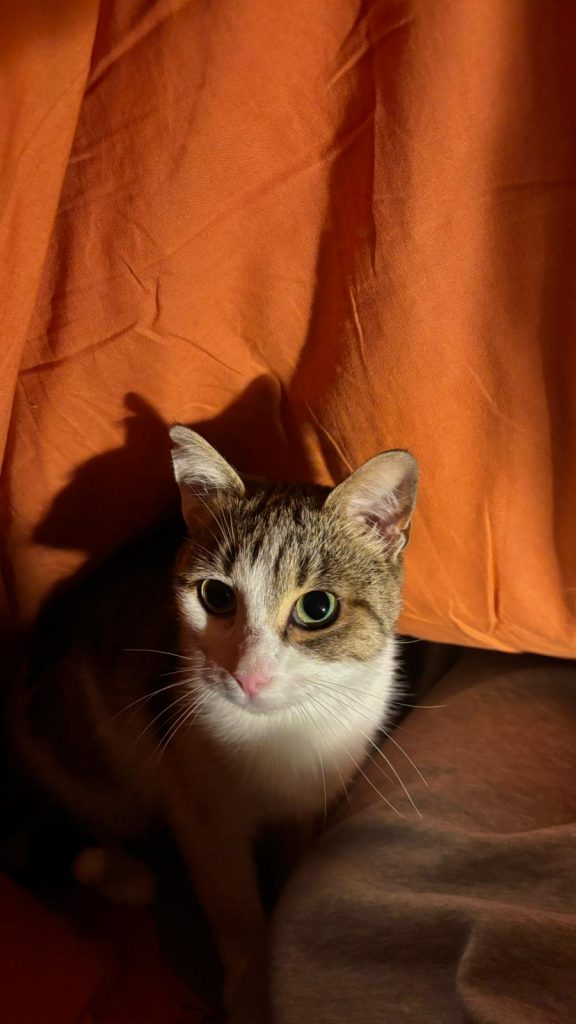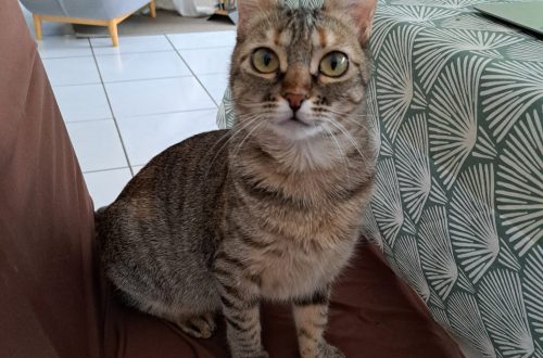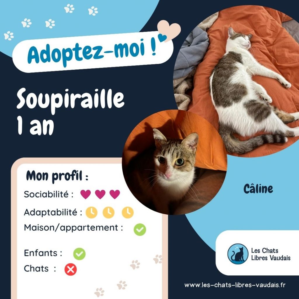 Soupiraille porte un drôle de prénom : elle vivait dans une cave, et sortait pour mangeait grâce à un passage qu’on appelle soupiraille. Alors nous l’avons nommé Soupiraille! Soupiraille est adorable, pleine d’amour et de reconnaissance envers son humaine. Elle est aussi joueuse, et très curieuse. Elle pourra jouer avec n’importe quoi (du jeu le plus sophistiqué, au jeu le plus simple!). Soupiraille est très câline, elle dort d’ailleurs avec son humaine. Elle mérite d’avoir une super famille, égale à ce qu’elle est !